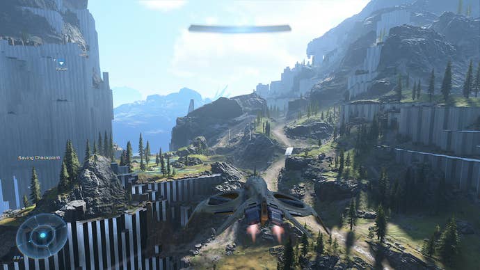 In that sense, Halo 3: ODST also comes to mind. In that game, you’d explore an open world city at night, but then would be thrown into more traditional and linear campaign levels. There’s shades of ODST throughout Infinite’s campaign structure; it’s an open world where at certain points you’ll enter a building or the like that triggers a short loading screen that transitions you into a more typical A-to-B-to-C Halo story mission. The core story of Infinite unfolds across a series of stages undertaken in a set order, but non-linearity creeps in through the side activities and exploration you can undertake across the ring between the main campaign missions.