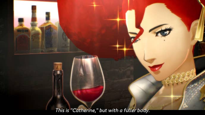 The story's choice-based progression evolves in the same way as the original: in the decisions you make while hanging out at the Stray Sheep bar. There you talk to its customers and learn about their own issues, catch up with your friends, drink, play the in-game puzzle arcade cabinet Rapunzel, and even talk to Rin, who Erica and the Boss of the bar have taken in as an employee. Vincent texts Katherine, Catherine, and Rin during these segments, swapping photos and choosing text messages very carefully. The Stray Sheep has a nifty jukebox too, where you can play a number of tracks from Catherine, Persona 5, Persona 4, and more's respective soundtracks. (You bet your ass I had Persona 3's "Burn My Dread" playing on loop.)