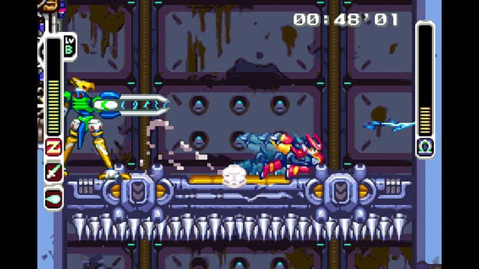 There's a new gameplay mode called "Z-Chaser" that lets you rip through select game stages as quickly as you can. You can compete with a pal, or with the world in general via leaderboards/ghost characters. Happily, the servers for Z-Chaser mode were turned on for the review period. Unhappily, I am not a speedrunning prodigy and I was destroyed even though my competition was slim pickings. I gave up on Z-Chaser quickly, but I've no doubt the more competitive Mega Man Zero and Mega Man ZX fans out there will have a ball.